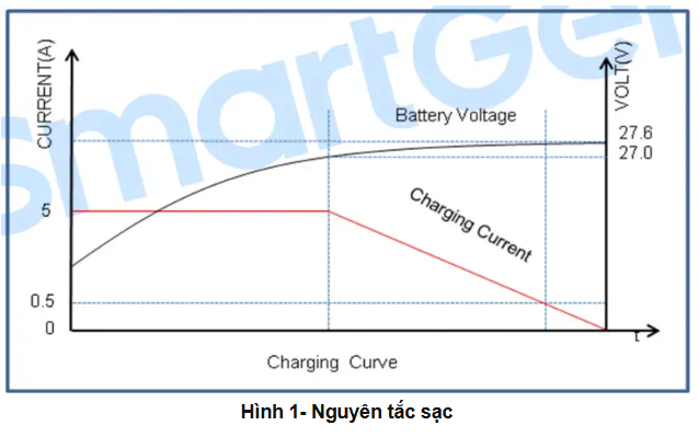 Điện áp không đổi/Sạc nổi (Constant Voltage/Float): Tự động chuyển sang chế độ duy trì điện áp 27.6V khi ắc quy gần đầy. Điều này ngăn ngừa sạc quá mức (overcharging) và kéo dài tuổi thọ ắc quy.