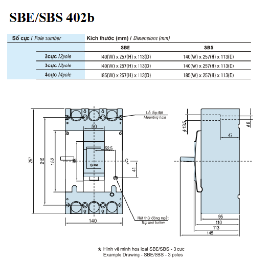 MCCB 2P 250A SBN402c/250 50kA được sử dụng trong các hệ thống điện 1 pha công suất lớn đòi hỏi khả năng bảo vệ sự cố mạnh mẽ: