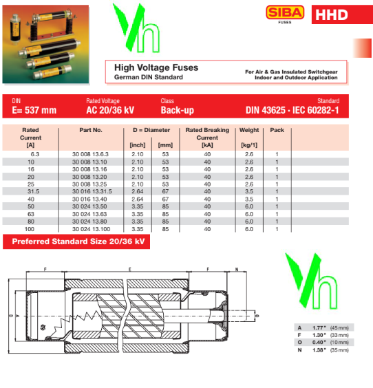 Cầu chì ống chì siba trung thế 20A 35 kV
